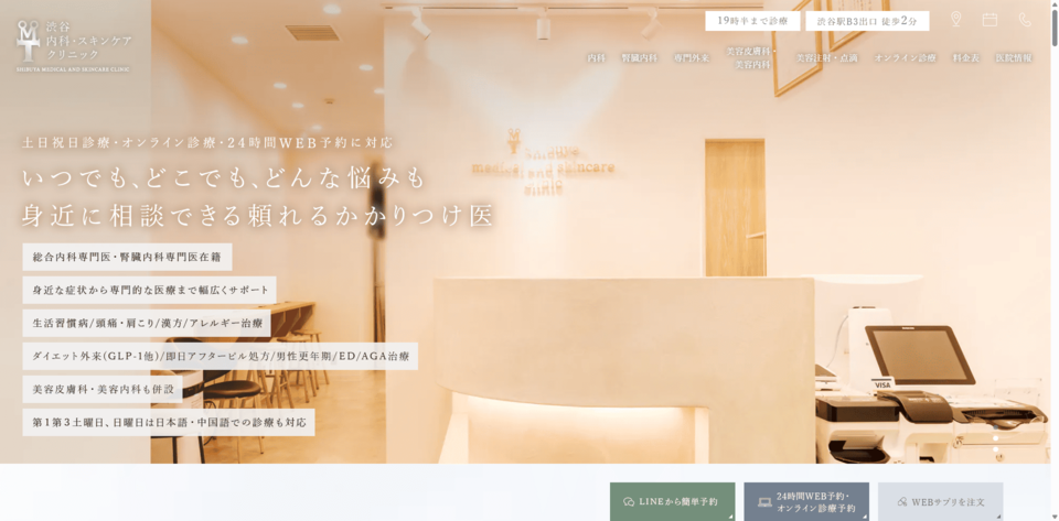 都内に複数院(渋谷・池袋・新橋・大手町・田町・四谷など)を展開し、平日夜間や土日も診療(院により時間が異なる)のため、通院とオンラインを使い分けたい方に向いています。